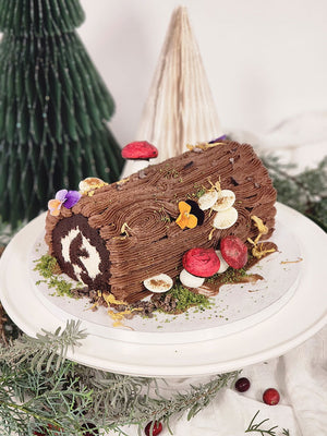 A giant toasted marshmallow Thicc roll topped with meringue mushrooms, shortbread moss, and local pressed flowers.