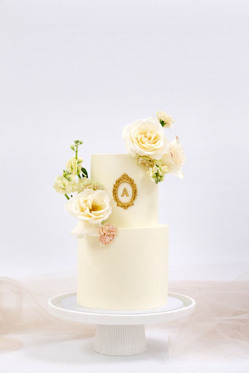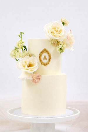 Let's seal this marriage with monogram. A clean white iced cake with a gold baroque framed monogram is elegant and timeless. Take this beauty to the next level and have our team add flowers for you, or let your florist get creative on site.